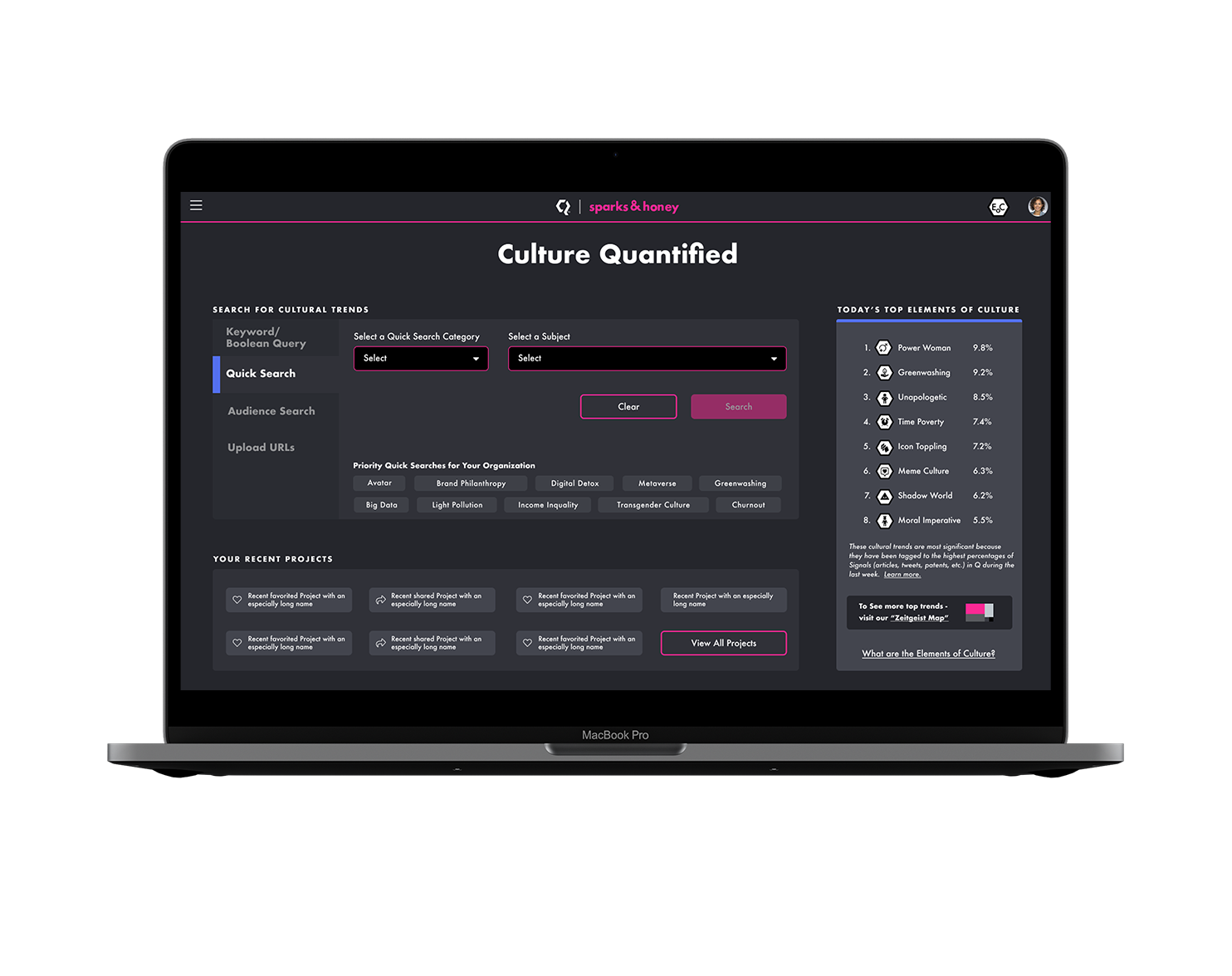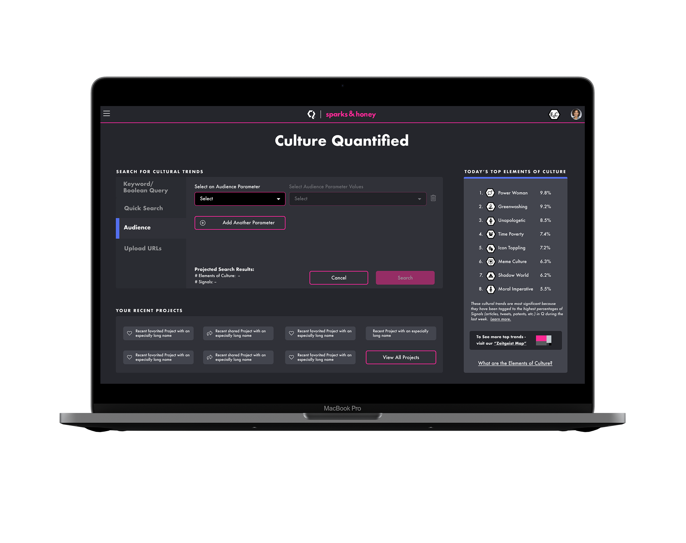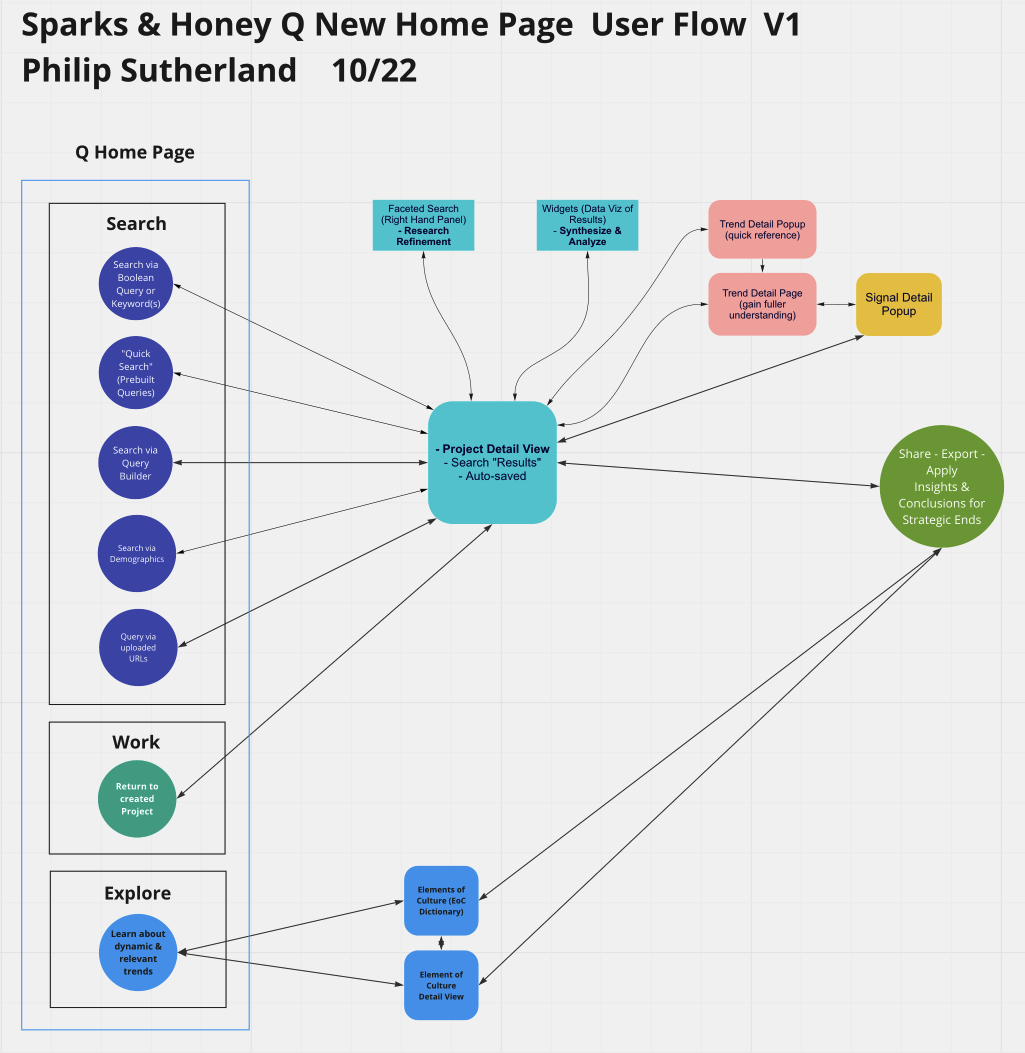 Although Q offers powerful technical capabilities, its original experience produced major pain points for users. The original Q "home page" required that users query the application using complex Boolean statements in order to receive the most relevant and structured insights about cultural trends. Since many or most users are not proficient in Boolean logic, they often received disappointing results. Additionally, because of the original information architecture, users could not easily access research "projects" they had previously undertaken on Q. This capability was important because most users worked on a particular project during multiple sessions over a period of days or weeks. Finally, Q employs a Sparks & Honey trend taxonomy - the "Elements of Culture" - to structure results, but this key framework was not introduced in the original home page. As a result, users often didn't fully understand query results.