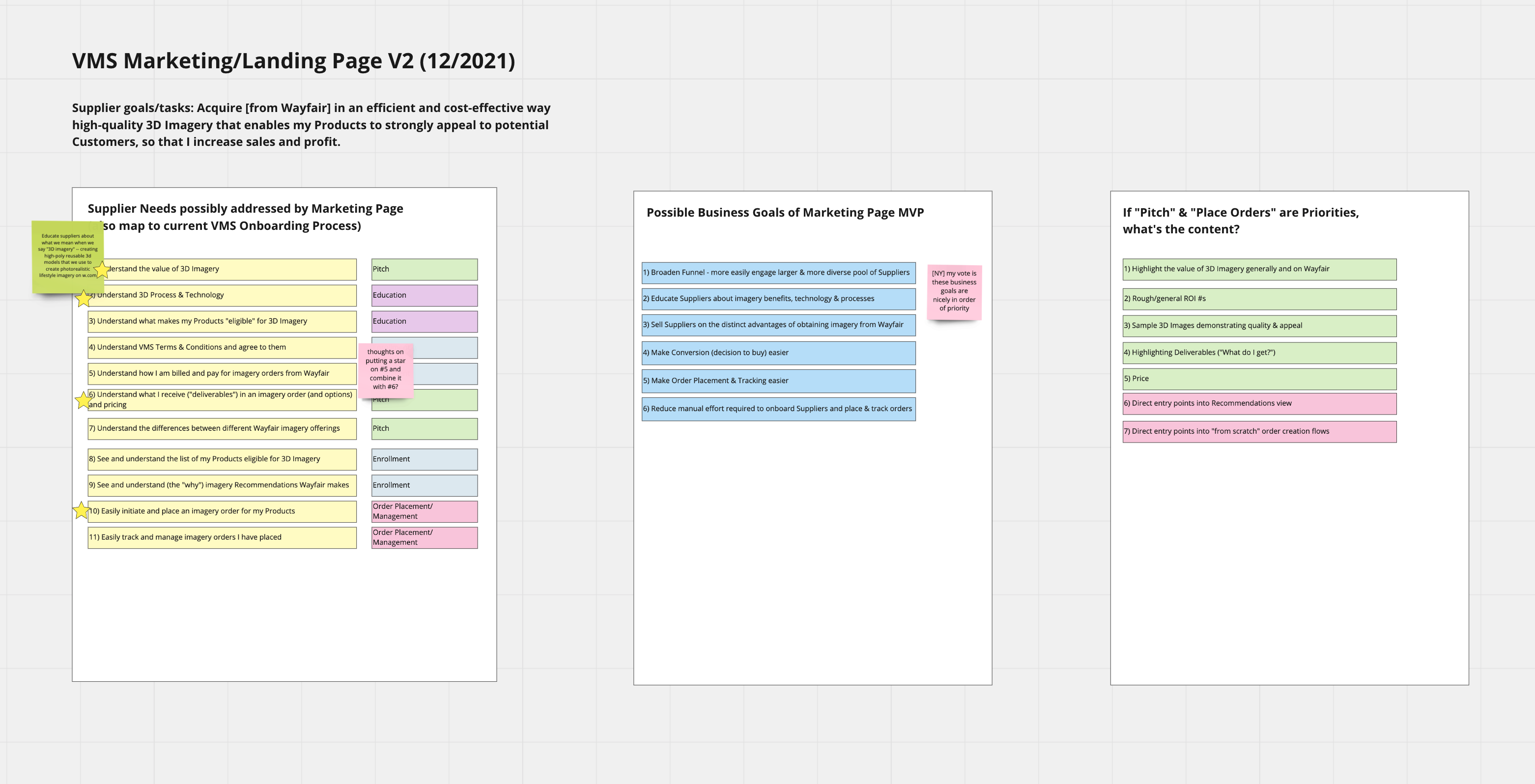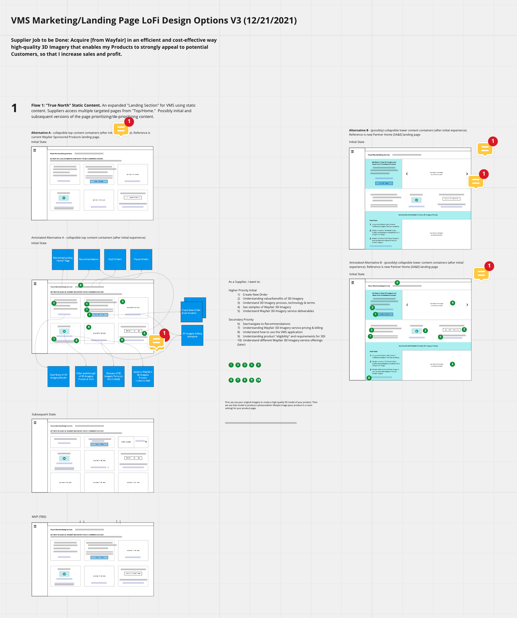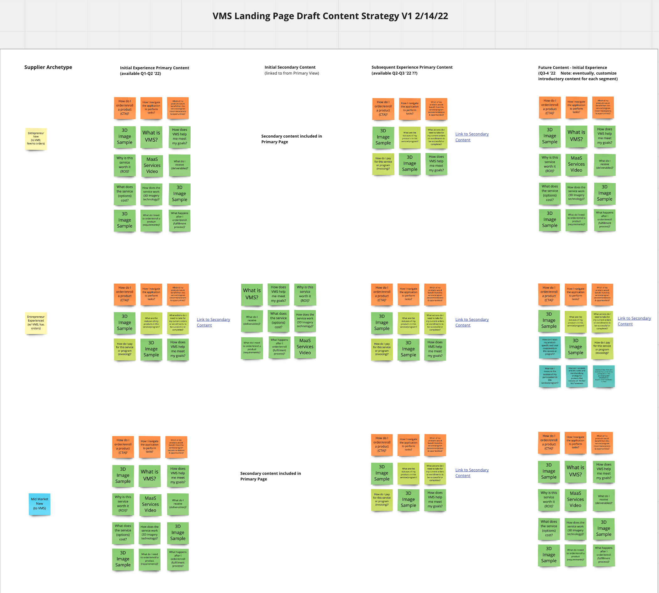 The "design deliverables" I created for the Visual Merchandising Services landing page included content clarification and prioritization analyses, wireframes, user flows, high-fidelity prototypes, and a content strategy matrix that maps over time user needs and "archetypes" against evolving (and customizable) versions of the landing page.
