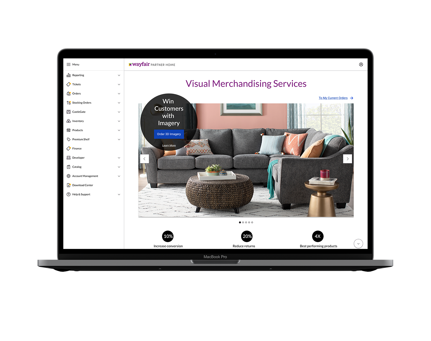 As a product design lead within Wayfair's, "Partner Home," platform, I designed several net new B2B applications. "Visual Merchandising Services" was one such major effort. This highly scalable application enables manufacturers and distributors partnering with Wayfair to place and manage orders for high-quality product (3D) imagery, a critical means by which offerings succeed in e-commerce.